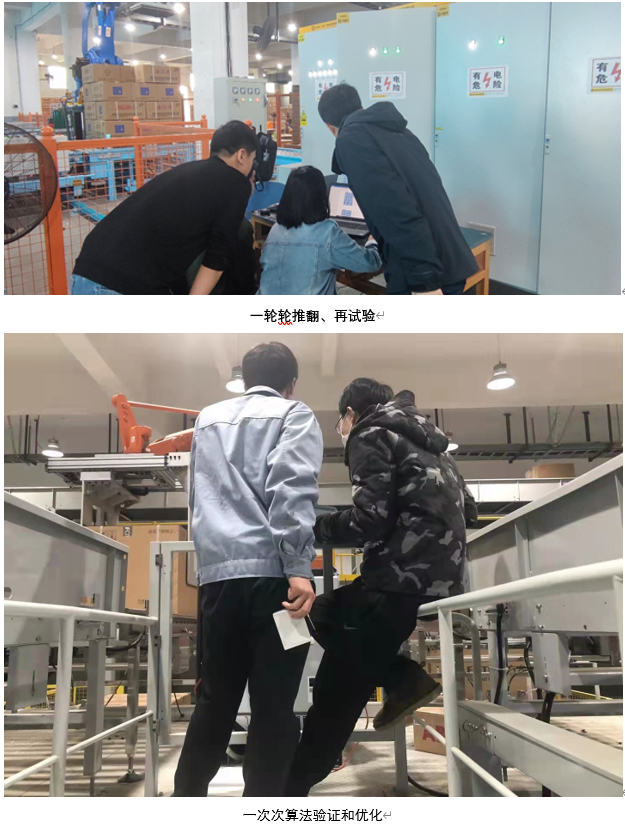 针对这一创新理念,在物流码垛行业几乎是空白,团队成员可借鉴的成功经验不多,所有的工作都要从零开始。万事开头难,项目组成立以后,迅速分工协作、开展工作。团队成员根据已有经验和问题导向,咨询业内专家分析可行性,提出多种大胆想法,一遍遍地设计验证,一次次地推倒重来。从创意的雏形初定到最终柔性码垛方案的完成,中间经历了无数波折与困难。那段时间,团队成员晚上加班编程,白天现场验证,顶住了巨大的压力,一路奋斗协作,“创新之火”在团队成员心中熊熊燃烧!