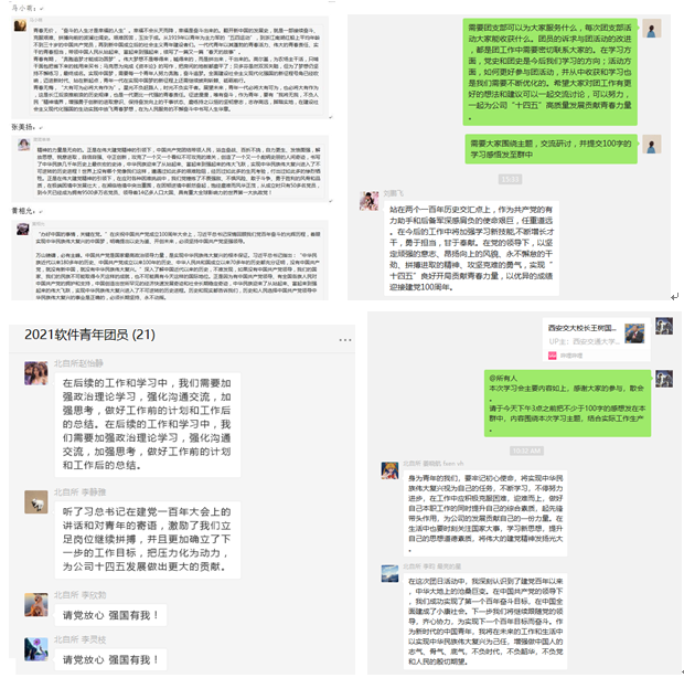 广大团员纷纷表示,通过学习领会习近平总书记“七一”讲话精神,深刻认识到正是在党的领导下,我们国家和民族才取得了一系列伟大成就,表明将始终坚持和拥护党的领导;充分理解党百年来带领人民获得民族独立、谋求民族复兴道路的不易,表示将牢记历史,珍惜当下的幸福生活。同时,团员青年结合自身工作实际,从业务或管理角度,对自身如何北自所“十四五”高质量发展贡献青春力量进行了交流研讨,大家指出,作为新时代青年,要努力为实现中华民族伟大复兴贡献力量,坚定信念目标、矢志艰苦奋斗,在工作岗位上踏实奉献、锻炼自我,在公司“十四五”发展的重要机遇期把握机会、努力提升、争创佳绩。