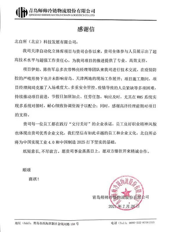 项目执行过程中,正值新冠疫情在我国冷链行业肆虐之时,北自科技团队展示了良好的精神风貌和职业素养,克服了重重困难,以认真的态度、专业的管理和过硬的技术感动了客户,客户特地发来感谢信,以表彰北自科技团队在项目中的突出表现。