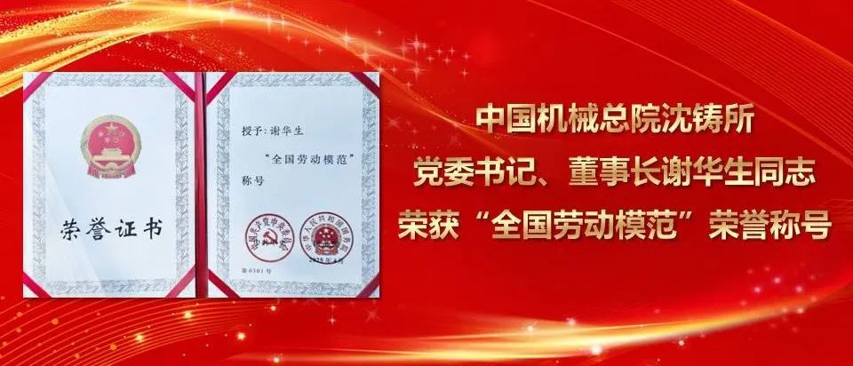 4月28日,全国劳动模范和先进工作者表彰大会在北京人民大会堂召开,中国机械总院集团沈阳铸造研究所有限公司党委书记、董事长谢华生荣获“全国劳动模范”荣誉称...