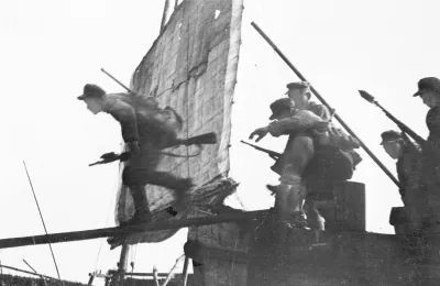 百万雄师下江南(1949年纪录片):胜利的旗帜插在长江南岸了,中国人民的百万大军完成了历史上空前的雄伟壮举,胜利地向江南地区前进,这是战争史上的奇迹,但也只有伟大的人民力量才能够创造出这样伟大的奇迹来。